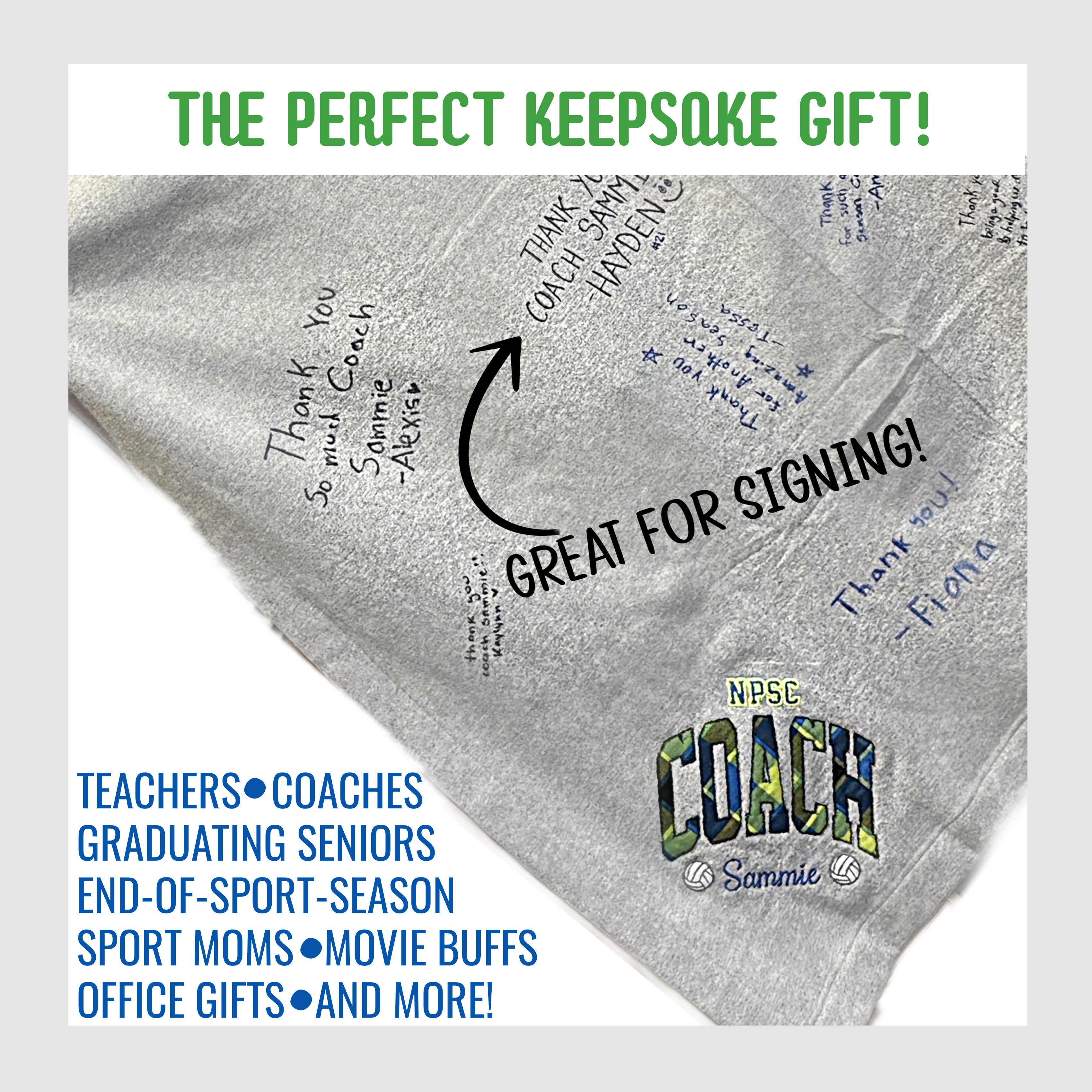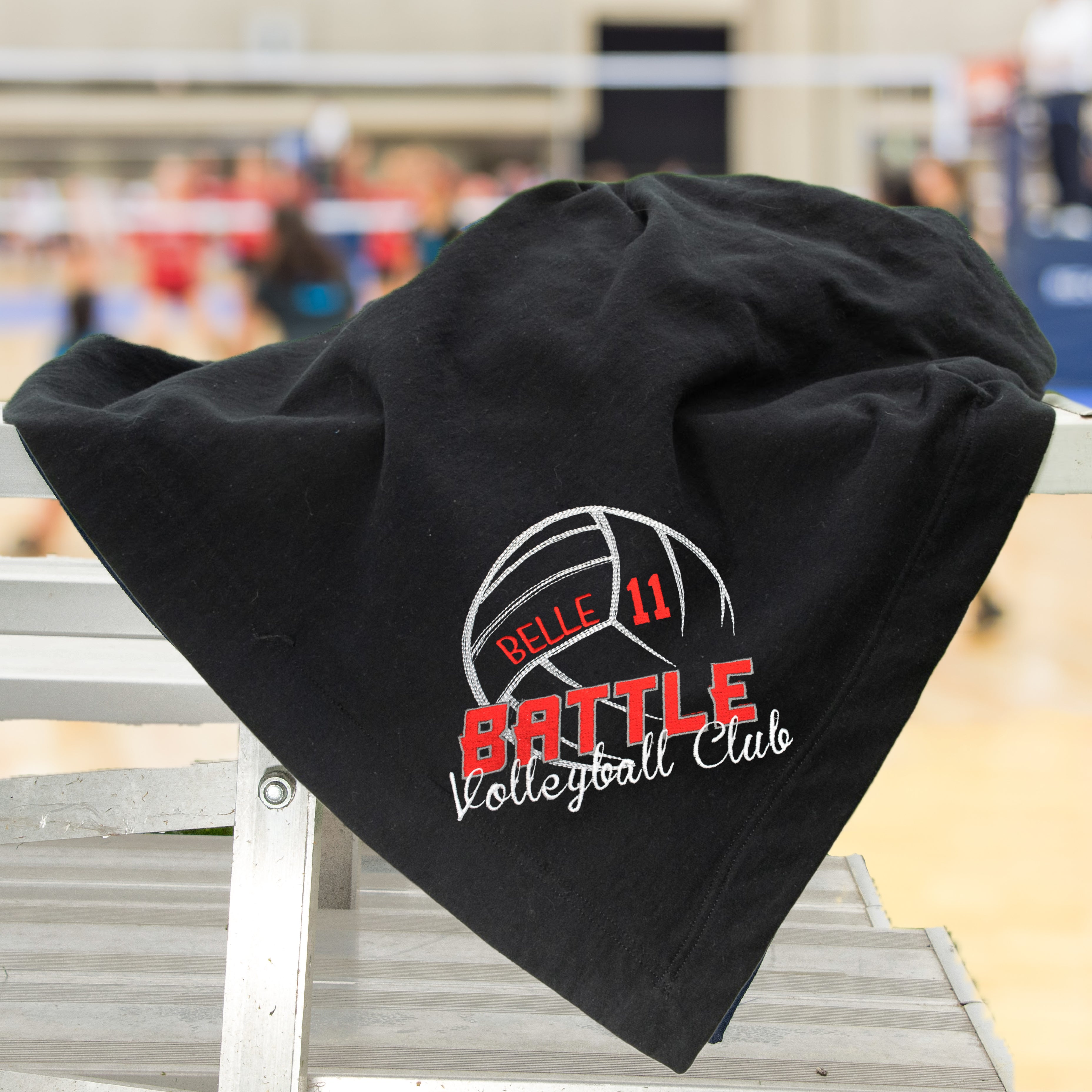 Battle Volleyball Club Colors come standard. Oversized stadium blanket with an abstract volleyball design, and your name and number add.  Wonderful for volleyball travel teams, end of the year gifts, and birthday gifts for any kid who loves volleyball!