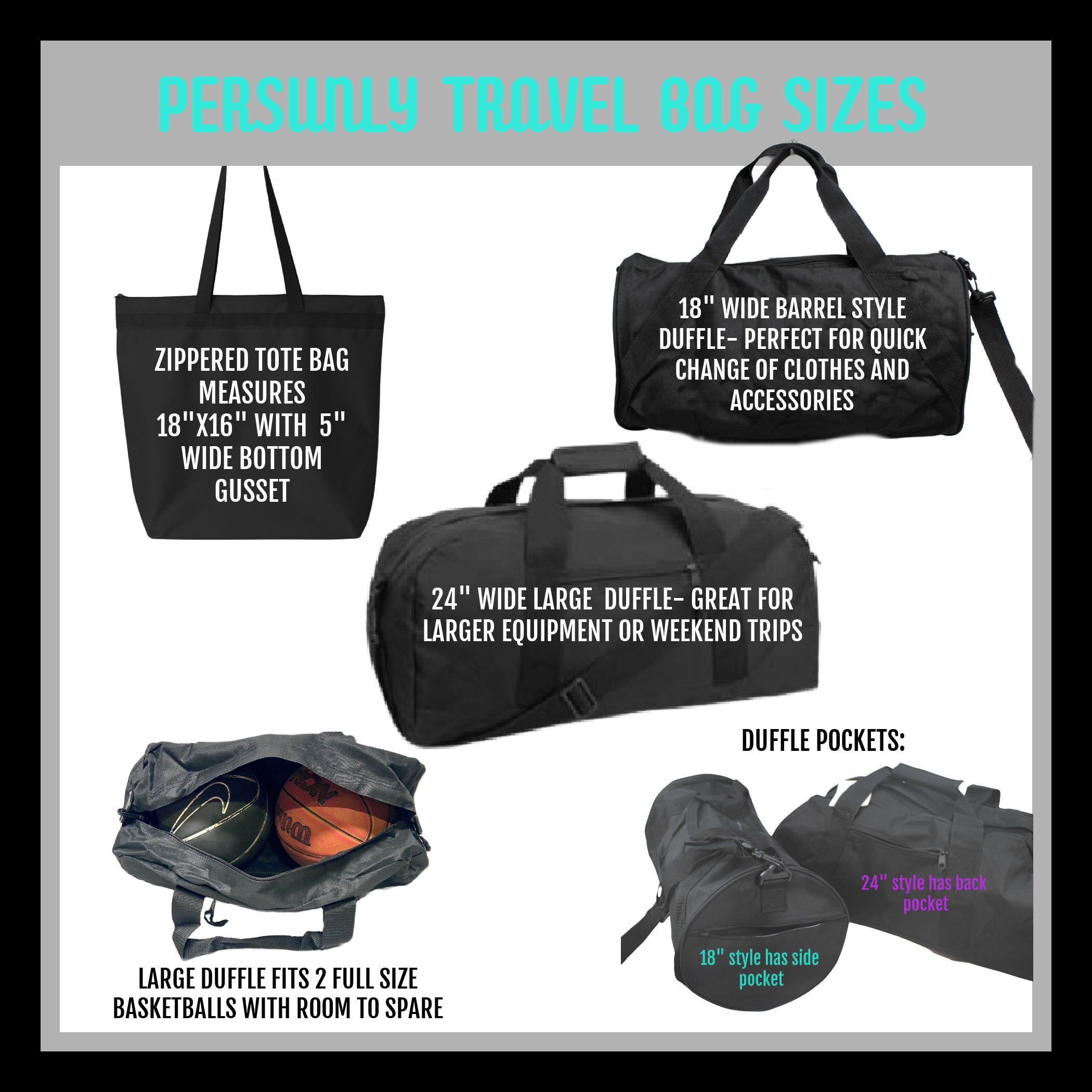 SMALL barrel duffle bag measures 18”x10”x10”, with a side zippered pocket.