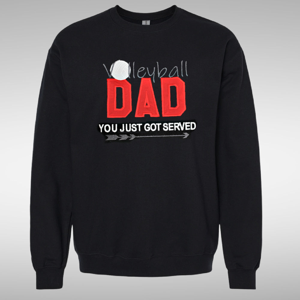 Volleyball DAD, you just got served!! Shown on a crewneck sweatshirt, but this would look great on a long sleeve shirt or hoodie! Personalize the sleeve with a jersey number or name!