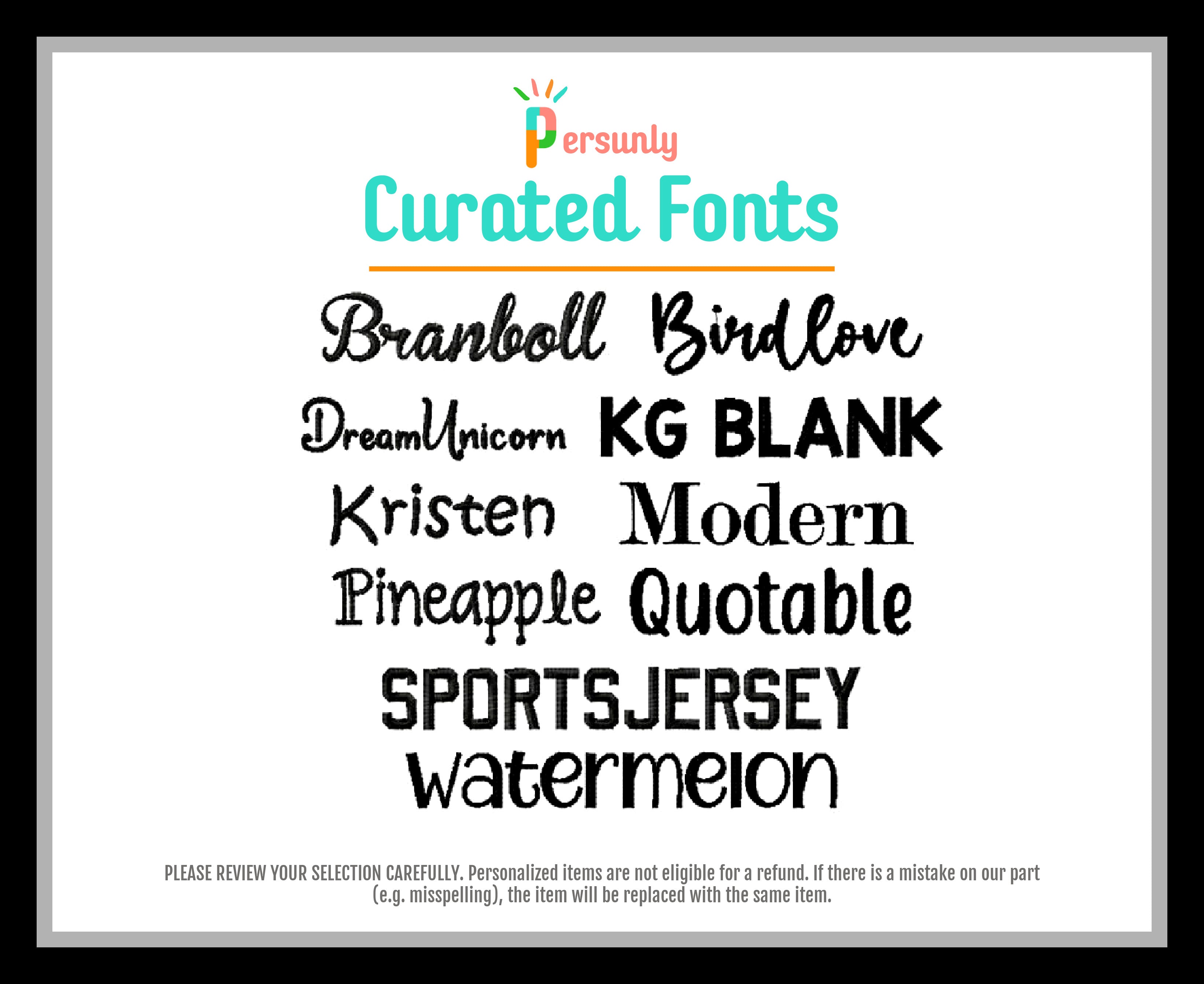 - Zipper and font color may vary. You may request specific colors in the note at checkout.
