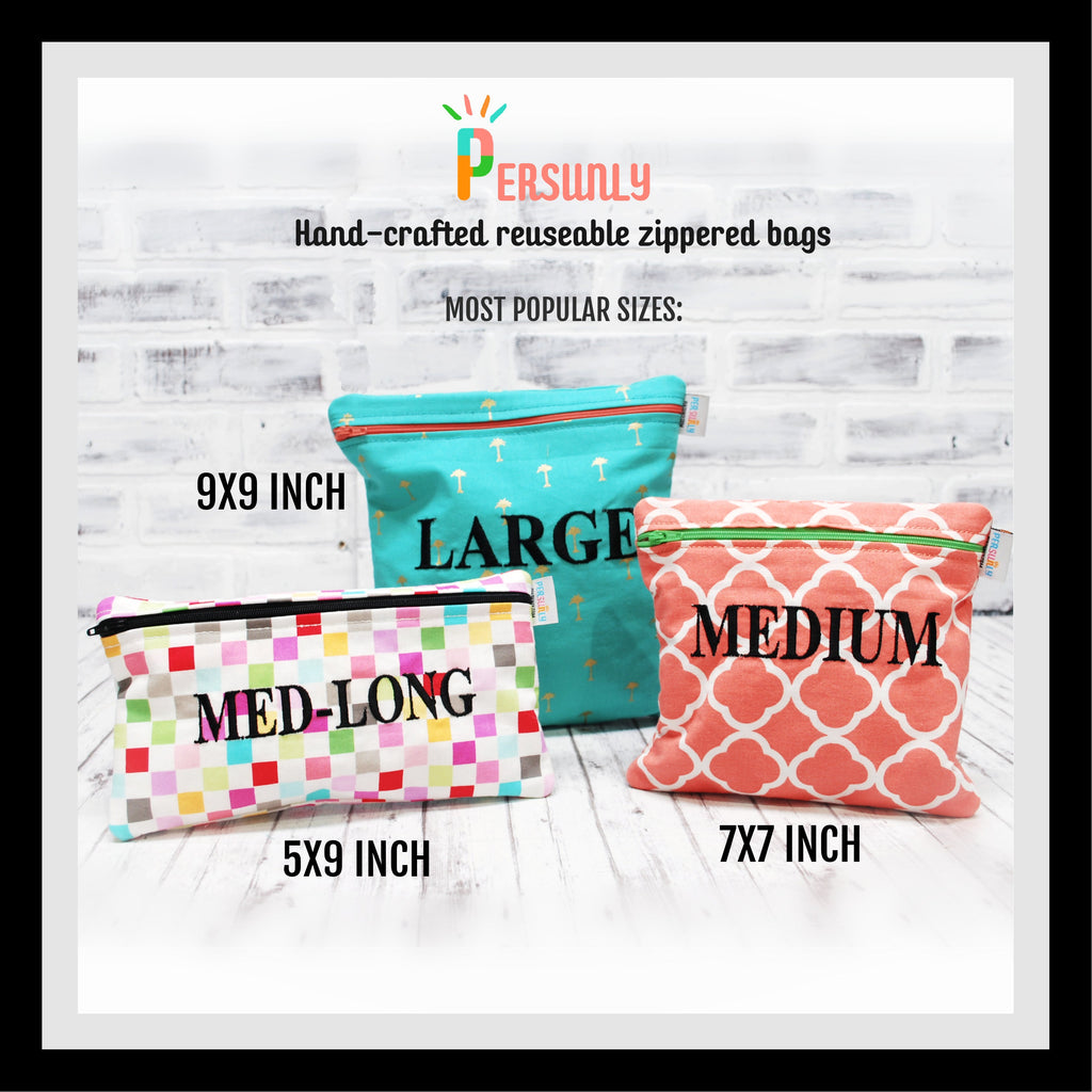 MEDIUM - At 7"x7" the sandwich size bag can hold a large sandwich or a variety of small snacks and is zippered to contain all contents easily.